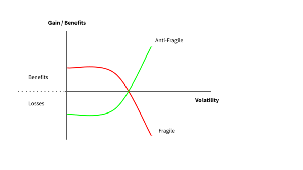Lo que me gusta de la teoría de Taleb es la idea de que en los sistemas o modelos frágiles, los beneficios potenciales están acotados, permanecen mientras todo se maniente estable y bajo control. Sin embargo, las pérdidas son exponenciales cuando llega la crisis. Sin embargo, en los modelo antifrágiles, las pérdidas potenciales están limitadas, mientras que los beneficios son exponenciales.